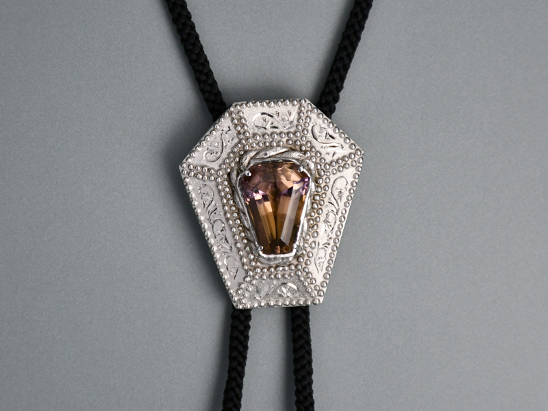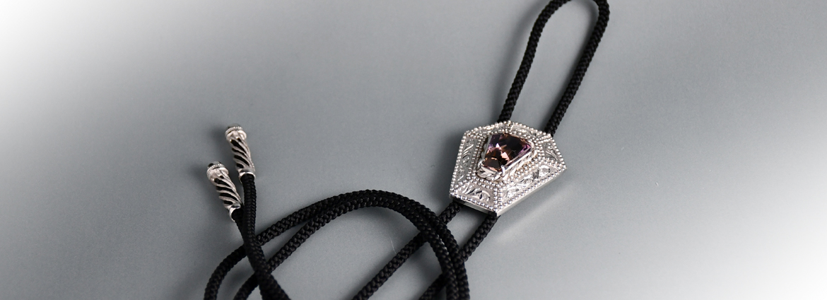 アメジストとシトリンの2色が楽しめるアメトリンと彫金の輝きが特徴の高級感溢れるループタイに仕上がっています。