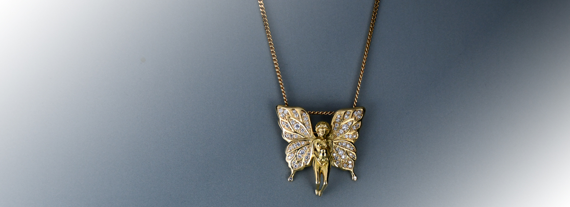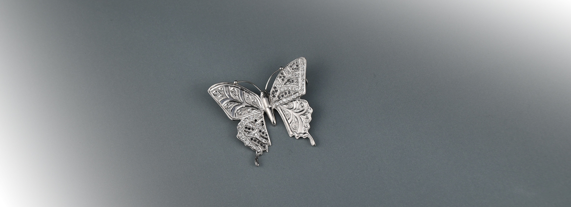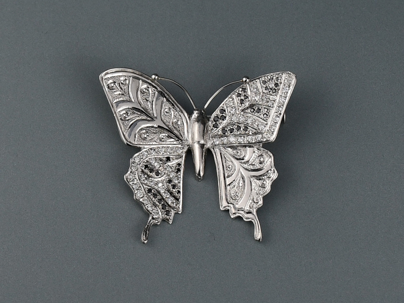 プラチナ製の蝶のブローチはダイヤモンドとブラックダイヤとのコントラストや輝きに彫金による輝きをプラスした大人の逸品に仕上がっています。