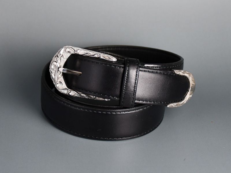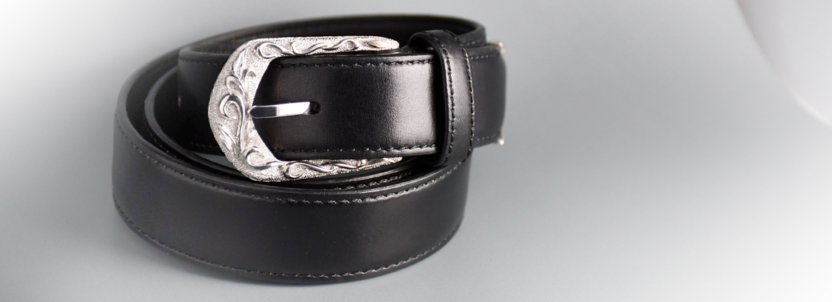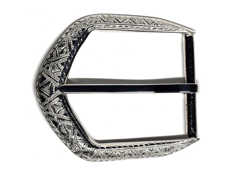 彫金の手作業ならではの細やかな凹凸と、奥行きある光と影を丁寧な磨きによって表現し、まるでジュエリーのような銀製のバックルです。
