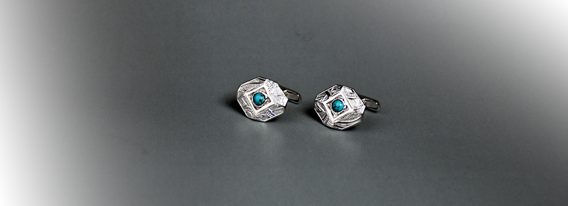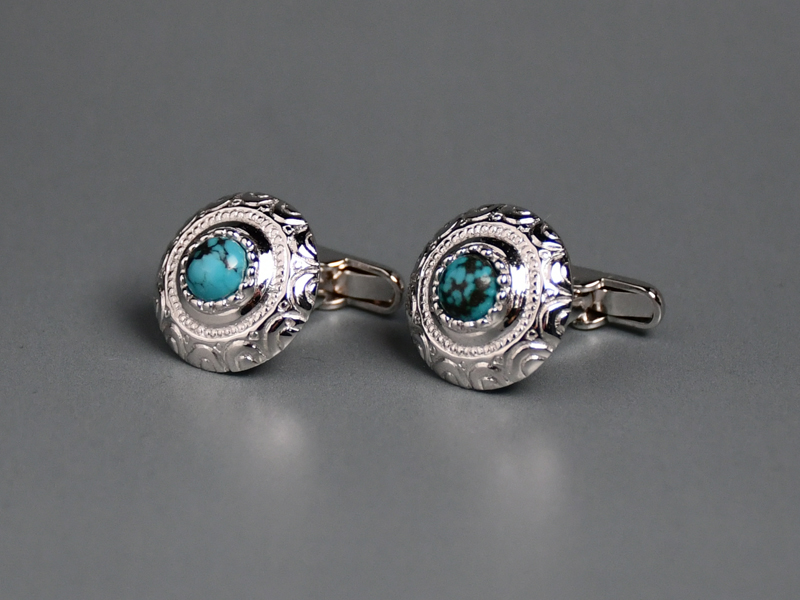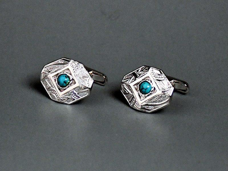 特徴的な八角形にオリエンタルな印象のデザインとターコイズを組み合わせた骨太な印象のカフスです。