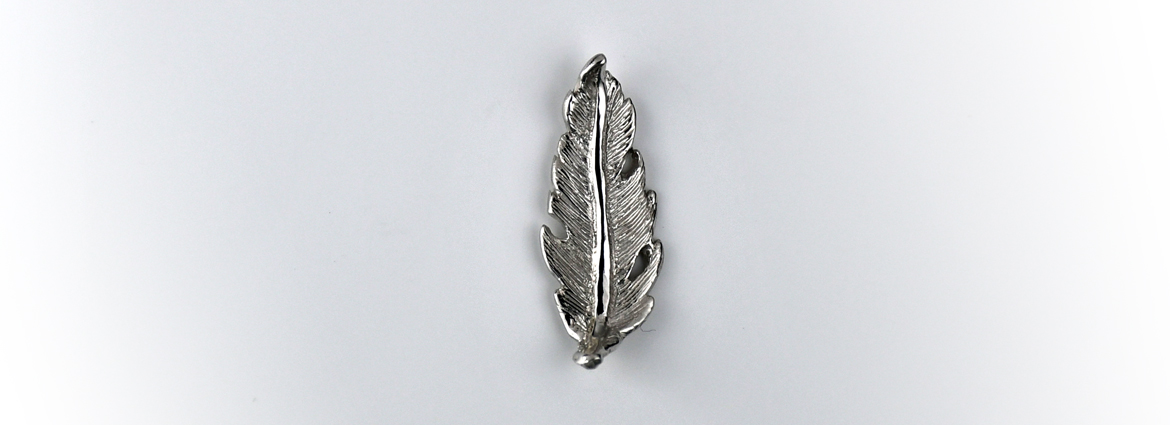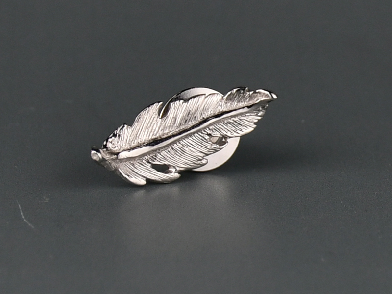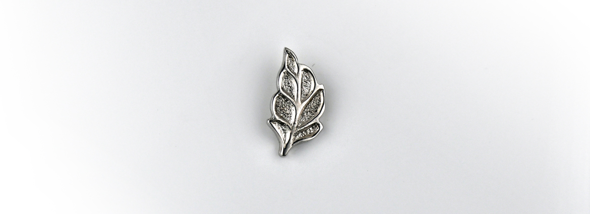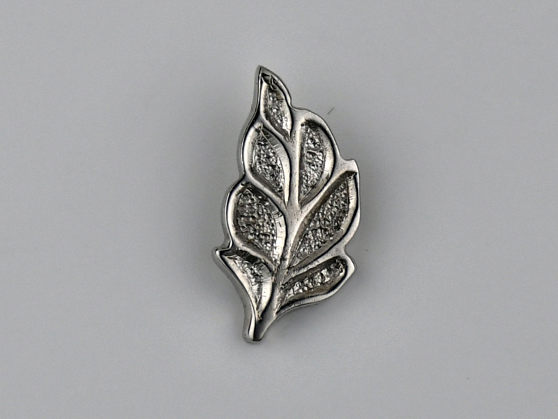葉がモチーフのピンズは彫金の深さで凹凸をつけて表現した一品。