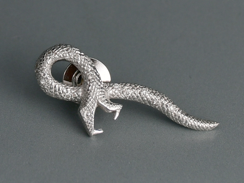 ホワイトゴールドの蛇を彫金とダイヤモンドで表現したラグジュアリーなピンズ。